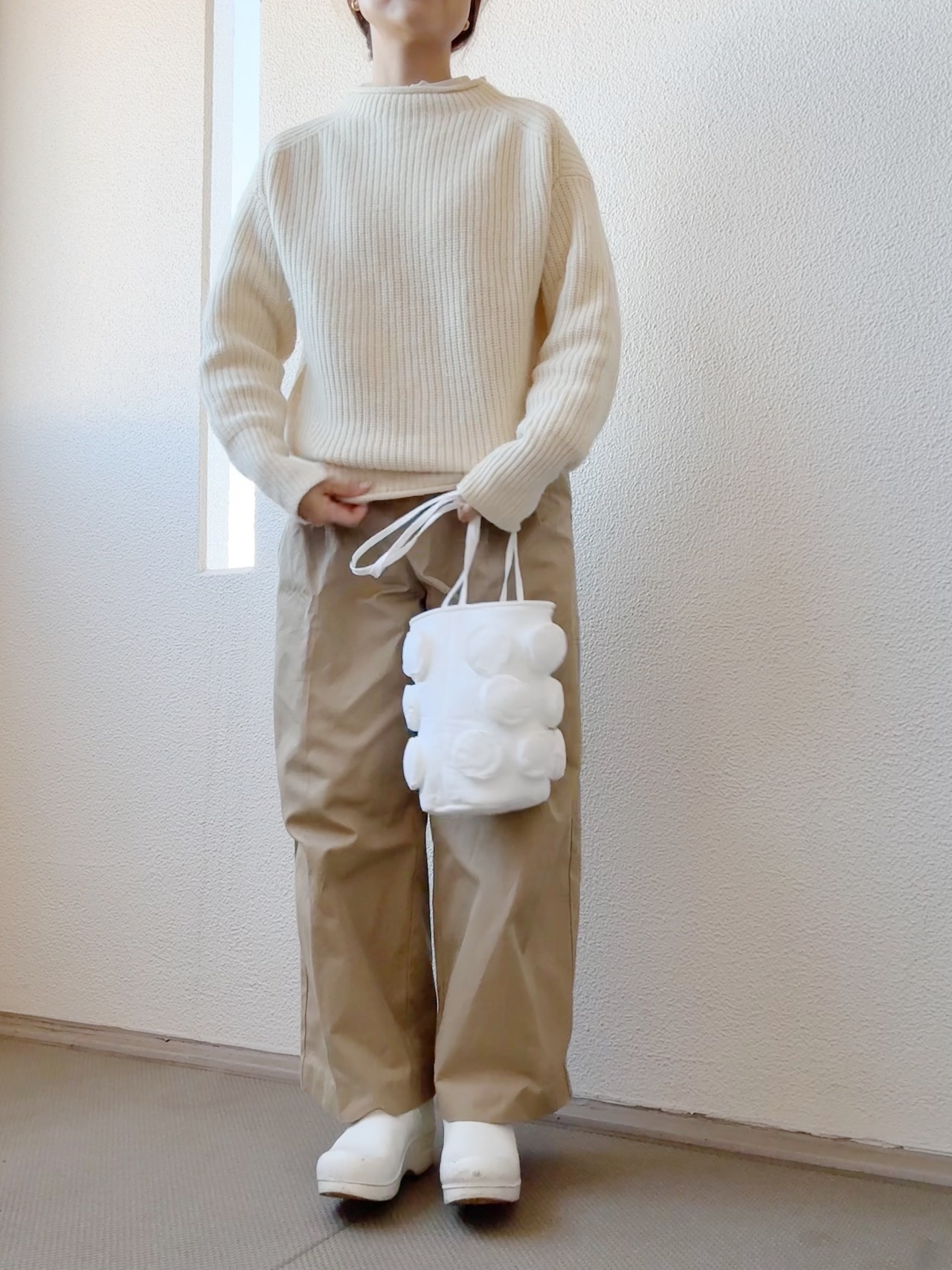 細い紐を2本使った持ち手にしたので、華奢な印象を与えて抜け感を出します。
